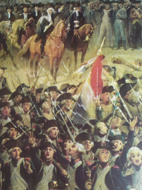 31 de maio de 1793. Os deputados girondinos após terem sua prisão decretada, deparam à saída da Assembléia com a maré de lanças dos plebeus que cercaram o edifício.
